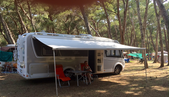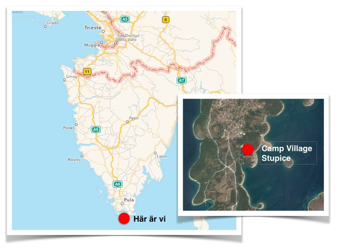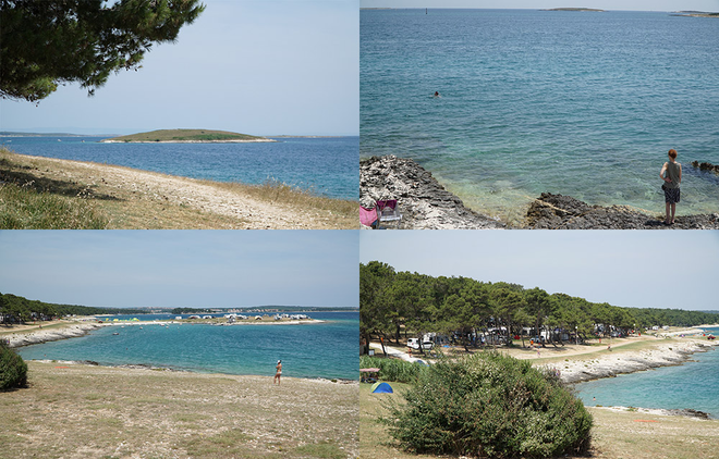 Men sen släppte det när vi kom ut på motorvägen mot Pula. Framåt kvällen kom vi till Camping Village Stupice längst ned på Istriahalvön. Det är en skogscamping vid havet med bra skuggiga platser (vilket behövs i värmen), lätta brisar från havet som svalkar och en oändlig kör av cikador som håller igång.
