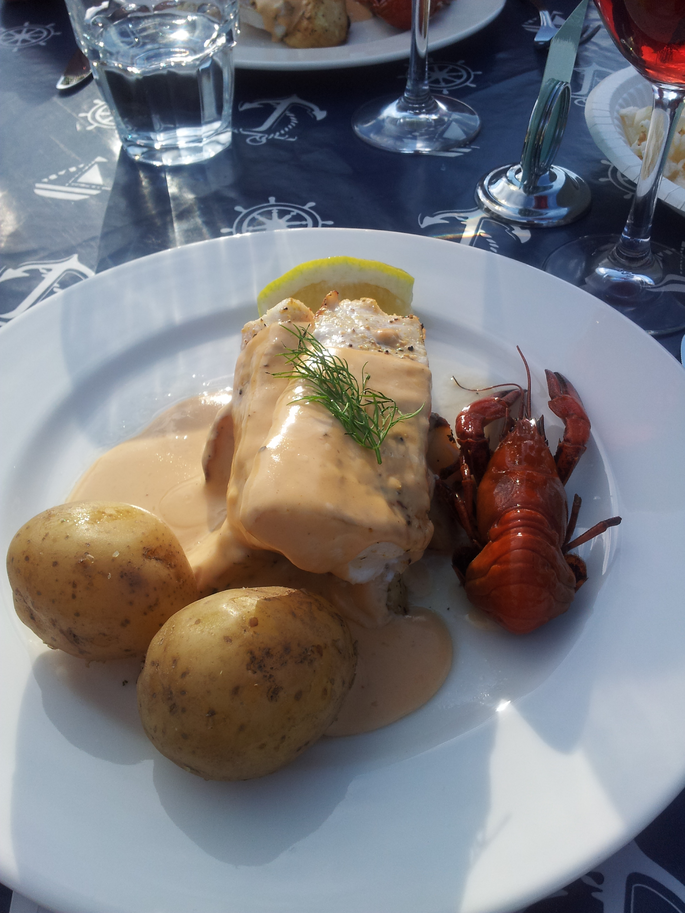 På kvällen åt vi en härlig middag med toast Skagen och gös på restaurangen.