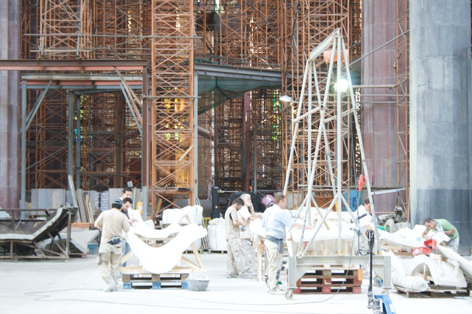 Gaudi har outtröttligt ägnat 40 år av sitt liv till denna konstruktion, på heltid i en liten studio mitt i byggplatsen. På frågan varför bygget framskred så sakta, svarade Gaudi skämtsamt: "Min uppdragsgivare har ingen brådska".